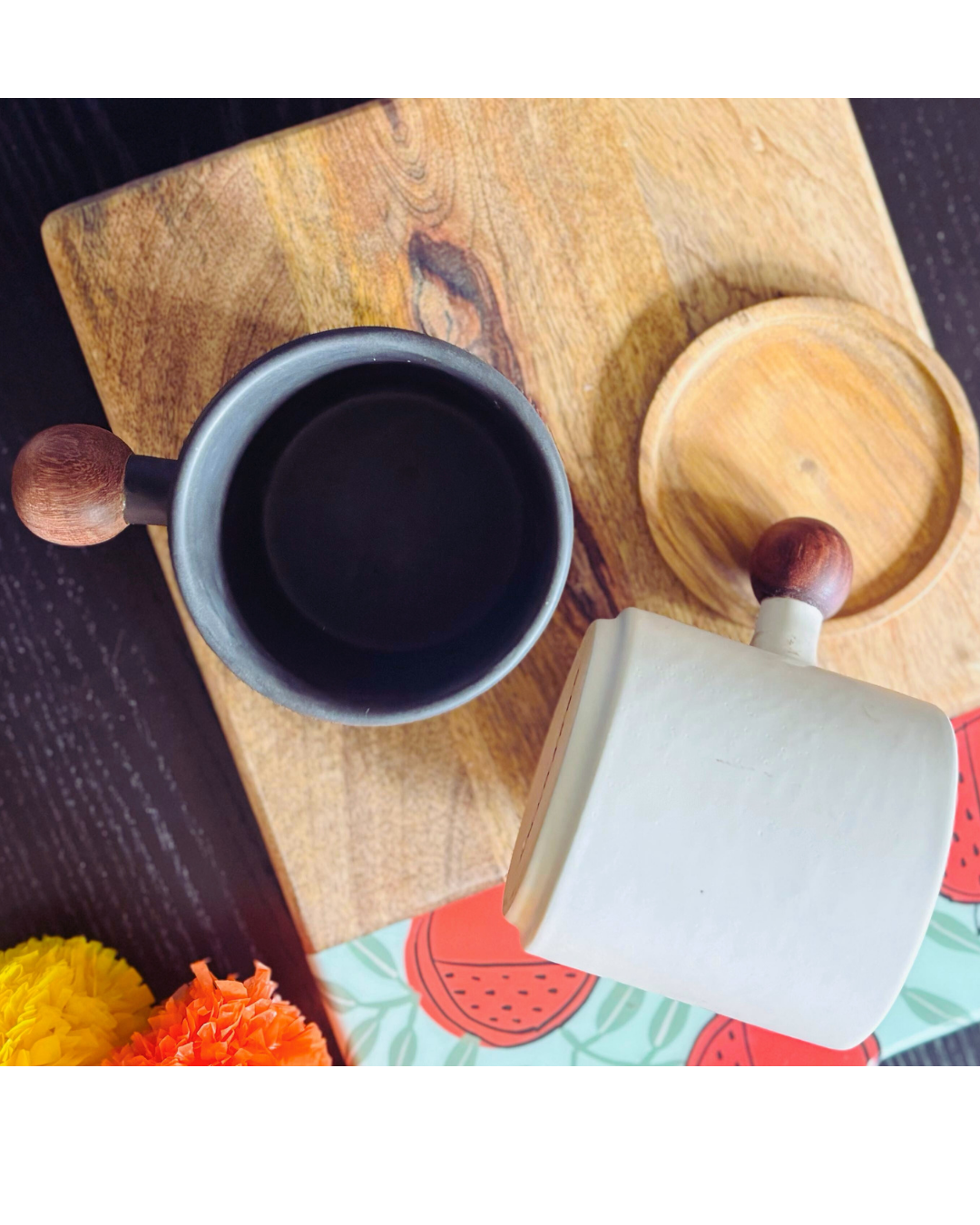 - Material: Ceramic (Mugs), Wood (Accents & Coasters)
